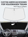 - DESIGNED IN USA!!! Custom Design: The front windshield shade has been custom cut specifically for Volkswagen VW Tiguan. Precise fit design and Reinforced steel rings make a precise and secure fit to the window, no need to use suction cups to hold it in place. It won't sag or collapse like other car heat shields. Fits for 2009-2017 Volkswagen VW Tiguan