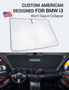 - DESIGNED IN USA!!! Custom Design: The front windshield shade has been custom cut specifically for BMW i3. Precise fit design and Reinforced steel rings make a precise and secure fit to the window, no need to use suction cups to hold it in place. It won't sag or collapse like other car heat shields. Fits for 2014-2022 BMW i3
