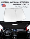 - DESIGNED IN USA!!! Custom Design: The front windshield shade has been custom cut specifically for Ford Fiesta. Precise fit design and Reinforced steel rings make a precise and secure fit to the window, no need to use suction cups to hold it in place. It won't sag or collapse like other car heat shields. Fits for 2017-2019 Ford Fiesta