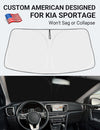 - DESIGNED IN USA!!! Custom Design: The front windshield shade has been custom cut specifically for Kia Sportage. Precise fit design and Reinforced steel rings make a precise and secure fit to the window, no need to use suction cups to hold it in place. It won't sag or collapse like other car heat shields. Fits for 2017-2022 Kia Sportage