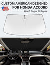 - Certified Sustainable. DESIGNED IN USA!!! Custom Design: The front windshield shade has been custom cut specifically for Honda Accord. Precise fit design and Reinforced steel rings make a precise and secure fit to the window, no need to use suction cups to hold it in place. It won't sag or collapse like other car heat shields. Fits for Honda Accord 2022 2021 2020 2019 2018.