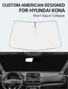 • Certified Sustainable. DESIGNED IN USA!!! Custom Design: The front windshield shade has been custom cut specifically for Hyundai Kona. Precise fit design and Reinforced steel rings make a precise and secure fit to the window, no need to use suction cups to hold it in place. It won't sag or collapse like other car heat shields. Fits for Hyundai Kona 2025 2024 2023 2022 2021 2020 2019 2018.