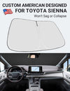 - Certified Sustainable. DESIGNED IN USA!!! Custom Design: The front windshield shade has been custom cut specifically for Sienna Mini Van. Precise fit design and Reinforced steel rings make a precise and secure fit to the window, no need to use suction cups to hold it in place. It won't sag or collapse like other car heat shields. Fits for Sienna Mini Van 2026 2025 2024 2023 2022 2021.