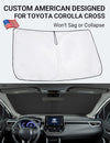 - DESIGNED IN USA!!! Custom Design: The front windshield shade has been custom cut specifically for Corolla Cross. Precise fit design and Reinforced steel rings make a precise and secure fit to the window, no need to use suction cups to hold it in place. It won't sag or collapse like other car heat shields. Fits for 2022-2025 Corolla Cross
